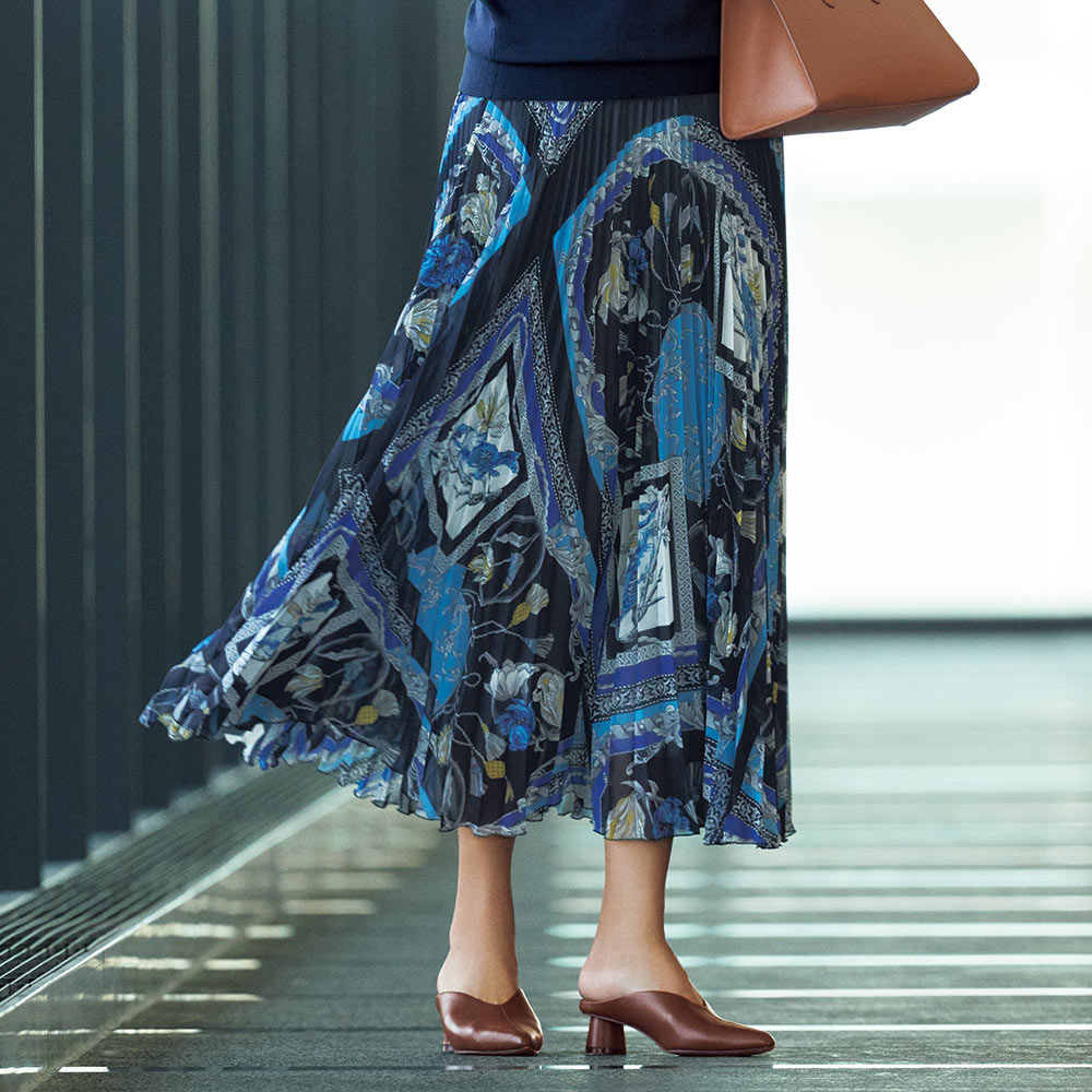 スカーフ柄の投入でネイビーが一気に華やぐネイビーベースと印象的なプリントで華やかに知性を薫らせた、仕事シーンに相応しいフェミニンスタイル。 スカートはダークネイビーをベースに鮮やかなブルーの濃淡を効かせたスカーフのような図案。 ボタニカル、鳥、タッセルモチーフを組み合わせたオリジナル柄です。 軽やかに透けるシフォン素材にはグラデーションプリーツが施されているので、ボリュームが出過ぎず動くたびにドラマティックな揺れ感が生まれます。 Point総ゴム仕様のウエストは印象を引き締める無地ネイビー。 トップスをインして見せてもきれい。 ページ下部に画像の説明がございます。 一部別売りの商品もございますので、説明文ご確認のうえご注文ください。 >画像の説明はこちら<仕様・サイズこの商品はセール品のため返品できません■色:ダークネイビー系■素材:表地…ポリエステル100%、裏地…ポリエステル100%■ウエストゴム仕様■原産国:中国製■この商品はプリーツ加工を施していますが、永久的なものではありません。 着用やお洗濯の繰り返しにより消失する恐れがあります。 ■商品により、柄の出方が多少異なります。 ■ウエストは、ゴム上がりの設定寸法です。 ◆サイズ(cm)【S】スカート総丈 78ウエスト 64ベルト幅 3.6【M】スカート総丈 80ウエスト 68ベルト幅 3.6【L】スカート総丈 82ウエスト 72ベルト幅 3.6【LL】スカート総丈 82ウエスト 76ベルト幅 3.6【3L】スカート総丈 82ウエスト 80ベルト幅 3.6【送料マーク:A】 この商品の販売価格には配送料880円(税込)が含まれています。 画像の説明コーディネート例コーディネート例 【クーポン最大5千円OFF 1/28迄】 スカーフ柄 シフォン プリーツスカート スカート ファッション PC5528 \LINE友だち登録でクーポン/ 18,680 ~