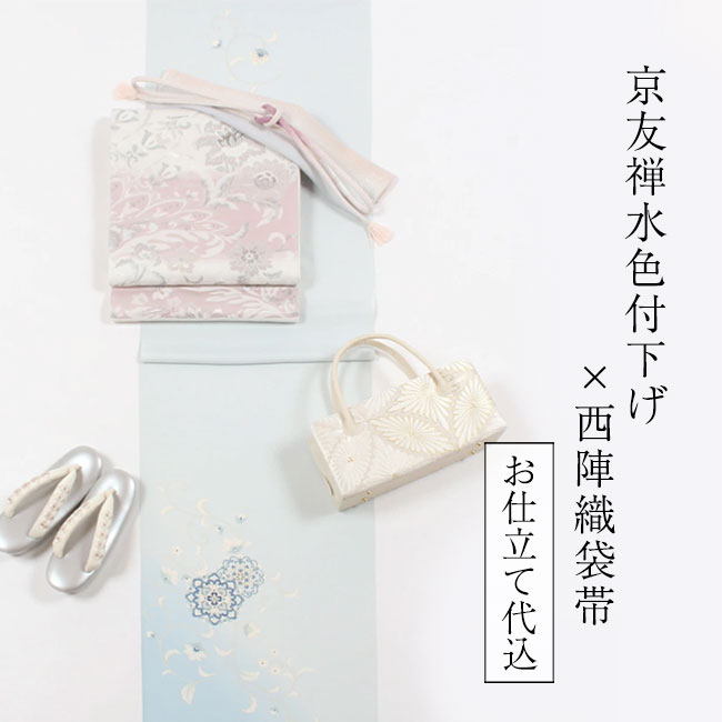 【1/28 ラスト8H限定ポイント3倍 & 最大1000円OFF】着物 セット 正絹 京友禅付下げ × 袋帯 セット 【お仕立て付き】 丹後ちりめん 京友禅「水色ぼかし 唐草華紋」& 【西陣織正絹袋帯】「唐花文」 付下げ 入学式 卒業式 着物セット フォーマル 170,500 ~