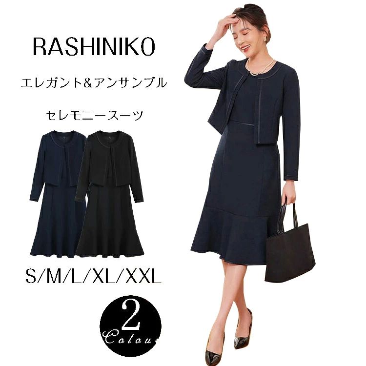ジャケットとワンピースがセットになったブラックフォーマルスーツ。 重くならないようエレガントさを重視し、細部にまでこだわったデザインに。 急なお通夜など、いざという時にあると使えるマストアイテムです。 入学式(入園式)や卒業式(卒園式)などのセレモニー、お受験や七五三などのフォーマルシーンはもちろん、喪服・礼服としてもご着用頂けます。 ジャケットはスッキリとした印象のノーカラー。 ペプラムにフリルを施したデザインがメリハリのある美シルエットに。 セットのワンピースはレディーなコクーンシルエット。 袖にギャザーを施したハーフスーリーブにウエスト切替でクラシカルな雰囲気。 ジャケットを脱いだ時にも清楚な印象に。 単品としてもきちんと感を醸し出しつつご着用頂けます。 体型カバーポイント【二の腕】【バスト】【ウエスト】【ヒップ】すっきりとした襟開きのノーカラーのジャケットは、やや高めのウエスト切替でワンピースと相性の良い絶妙な丈感。 ワンピースは二の腕を隠してくれるハーフスリーブで、やや高めのウエスト位置で脚長・美脚効果を与え、タックが気になるウエストラインを曖昧に。 膝下の上品な丈感が下半身のボディラインを覆い隠します。 素材さらりとしたしなやかな素材で、シーズン問わずご着用いただけます。 ご自宅で手洗い可能なイージーケアアイテムなのも嬉しいポイント♪ストレッチが効いてるので、着心も抜群です。 サイズS(7~9号対応)ジャケット: 着丈54.5cm / 肩巾37cm / バスト97cm / ウエスト76cm / 袖丈58.5cm / 袖口巾12.5cmワンピース: 着丈103cm / 肩巾36cm / バスト85cm / 袖丈26cmM(9~11号対応)ジャケット: 着丈56cm / 肩巾38cm / バスト101cm / ウエスト80cm / 袖丈59cm / 袖口巾13cmワンピース: 着丈104.5cm / 肩巾37cm / バスト89cm / 袖丈26.5cmL(11~13号対応)ジャケット: 着丈57.5cm / 肩巾39cm / バスト105cm / ウエスト84cm / 袖丈59.5cm / 袖口巾13.5cmワンピース: 着丈106cm / 肩巾38cm / バスト93cm / 袖丈27cm2L(13~15号対応)ジャケット: 着丈57.5cm / 肩巾40.5cm / バスト111cm / ウエスト90cm / 袖丈60cm / 袖口巾14cmワンピース: 着丈106cm / 肩巾39.5cm / バスト99cm / 袖丈27.5cm詳細情報厚み:□薄手 ■普通 □厚手透け感:■なし □あり光沢感:■なし □あり伸縮性:□なし ■ややあり □あり裏地:□なし ■ありカラーバリエーション・ネイビー上品で落ち着いた印象のネイビーは、周りからの好感度も抜群。 日本人女性の肌に似合いやすく、スリム見せ効果も発揮します。 シーンを選ばず着回せる万能さが人気のカラーです。 ・ブラック季節を選ばないフォーマルシーンの王道カラー。 深い色が引き締め効果を高め、気になるボディラインをスッキリ美しく見せます。 コーデ次第で華やかにもシックにも着回しができる鉄板色です。 こんなシーンにおすすめ入学式、卒業式、入園式、卒園式、ハレの日、セレモニースタイル、七五三、オフィス、通勤、結婚式、パーティー、二次会、謝恩会、演奏会、発表会、フォーマル、セレモニー、リクルート、ビジネス、冠婚葬祭、お宮参り、七五三、食事会、ブラックフォーマル、慶弔インフォメーション【ショップのお気に入り登録】ブランドのお得な情報を受取ることができます。 【商品のお気に入り登録】再入荷通知やラスト1点の通知、お得な情報を受け取ることができます。 別カラーはこちら! ブラック フロリア Flolia 【喪服 礼服】ノーカラーペプラムジャケット コクーンワンピース セットアップ スーツ ブラックフォーマル セレモニー 卒業式 卒園式 入学式 入園式 ママスーツ 七五三 ママ 17,900 ~